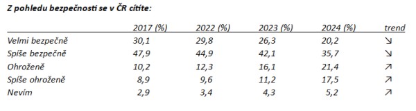 Jestliže se v roce 2017 bezpečně (velmi bezpečně + spíše bezpečně) cítilo 78 % lidí a nebezpečně (ohroženě + spíše ohroženě) cca pětina dospělých obyvatel a letos se bezpečně cítí už jen větší polovina a ohrožení vnímá téměř 40 % z nás, myslím, že se to nelíbí nejen mně, ale převážné většině občanů.