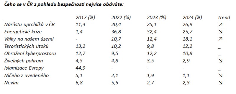 Obavy občanů z teroristických útoků, ohrožení kyberprostoru a z živelných pohrom se v posledních sedmi letech udržují přibližně na stejné úrovni, rozdíly jsou většinou v řádu statistické odchylky. Pokud jde o kyberprostor, jsem mírně překvapen tím, že občané vlastně nereagují na v poslední době velmi intenzivní varování části politiků, že znepřátelené země se nás v tomto směru chystají více ohrožovat. Buď lidé těmto zprávám příliš nevěří, nebo důvěřují realizovaným státním či soukromým opatřením k ochraně kyberprostoru, nevím.