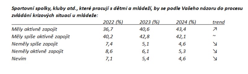 Oproti podpoře zařazení bezpečnostních témat do školních osnov je tady trend opačný. Vidíme, že stále více lidí (85,5 %) si přeje, aby sportovní kluby převzaly část odpovědnosti a přispěly k tomu, že děti budou lépe vybavené na zvládání různých krizových situací.