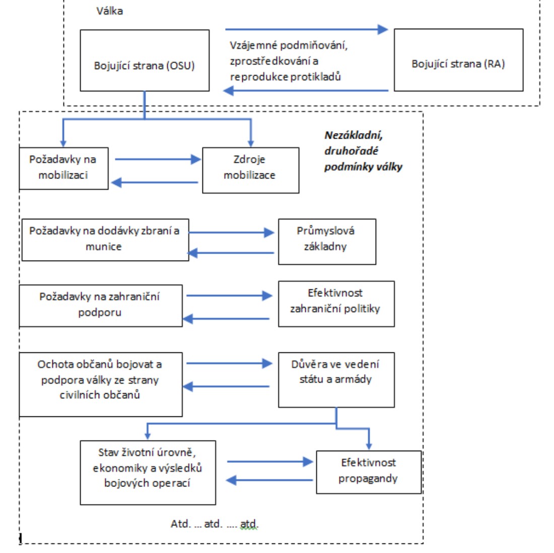 Vzájemné podmiňování, zprostředkovávání a reprodukce bojujících stran, stav, kdy jedna bojující strana je pro tu druhou příčinou, dává podnět k mobilizaci, výcviku nových vojáků a doplnění ztrát v ozbrojených silách, nebo jejich navýšení. Rovněž dává podnět směrem k vlastnímu průmyslu, k výrobě zbraní, munice a všeho potřebného pro zabezpečení bojující armády. Dále dává podnět směrem k vlastnímu ministerstvu zahraničí hledat spojence a bránit v získávaní spojenců protistraně. Podnět můžeme chápat i jako příčinu.