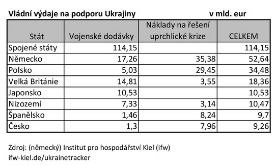 Ale podívejme se na angažovanost zemí, podle Kielského institutu pro hospodářství, který zpracoval přehled výdajů jednotlivých států ve prospěch Ukrajiny. Institut vyčísluje jednak výši vojenských dodávek v miliardách eur a také náklady na řešení uprchlické krize. Česká republika je mezi zeměmi Západu, které se účastnily pomoci Ukrajině na 8. místě za hospodářsky násobně silnějšími státy, jako jsou USA a Německo (viz přiložená tabulka). A v objemu výdajů na věc Ukrajiny Česká republika i v absolutním vyjádření předstihla třeba Francii. Tedy všechny ostatní země Západu, kromě sedmi v tabulce před Českem uvedených, mají pomoc ve prospěch Ukrajiny podstatně nižší. Abychom vyjádřili pomoc české vlády v korunách, je to zhruba 232 miliard Kč (při použití kurzu euro:koruna 1:25).