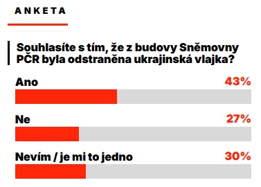 Na pozadí ostré výměny názorů ve Sněmovně i v médiích proběhla mezi 7. a 13. listopadem roku 2025 rozsáhlá čtenářská anketa serveru První zprávy. Celkem 170 358 čtenářů odpovědělo na jednoduchou otázku, zda souhlasí s odstraněním ukrajinské vlajky z budovy Sněmovny Parlamentu České republiky. Výsledky ukázaly, že 43 procent hlasujících s krokem souhlasí, 27 procent vyjádřilo nesouhlas a 30 procent uvedlo, že neví nebo jim je celá věc lhostejná. Jde o mimořádně vysoký počet hlasů u dobrovolné internetové ankety, která sice nemůže nahradit profesionální reprezentativní výzkum, ale do jisté míry odráží náladu mezi aktivními čtenáři sledujícími politické dění.